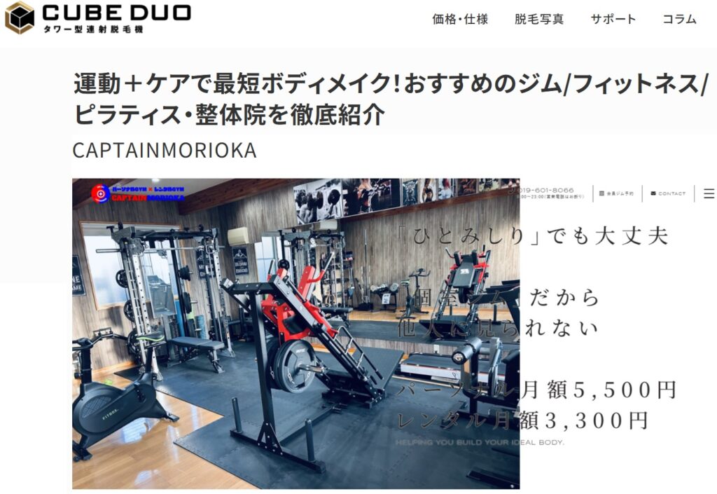 コンテンツ CONTENTS ホーム コンテンツ 業務用脱毛機「CUBE DUO」の運営するメディア内のコラム記事「運動+ケアで最短ボディメイク!おすすめのジム/フィットネス/ピラティス・整体院を徹底紹介」にCAPTAINMORIOKAが掲載されました。 2026.04.13 業務用脱毛機「CUBE DUO」の運営するメディア内のコラム記事「運動+ケアで最短ボディメイク!おすすめのジム/フィットネス/ピラティス・整体院を徹底紹介」にCAPTAINMORIOKAが掲載されました。 スタッフブログ CAPTAINMORIOKAが紹介されている記事は【こちら】 業務用脱毛機「CUBE DUO」の詳細は【こちら】 一覧へ戻る
